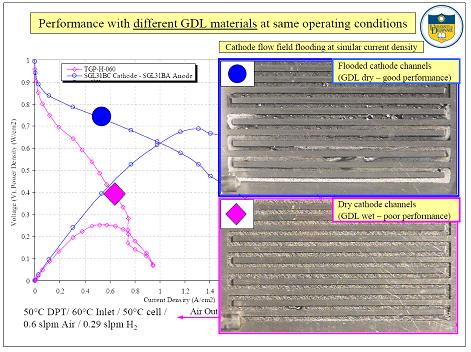 Cell performance and water management are greatly influenced by the GDL material. Liquid water formation and transport were investigated optically in both cathode and anode channels across the entire cell. We examined the effectiveness of various GDL materials in removing water from the cathode CL into the channels. Level of the cathode flow field flooding was recognized as a criterion for the water removal capacity of the GDL materials. When compared at same current density (i.e. water production rate), higher amount of liquid water in the cathode channel indicated that water had been efficiently removed from the catalyst layer. Our findings show that the cell performance can be increased several times solely by manipulating the water management properties of the GDL material.