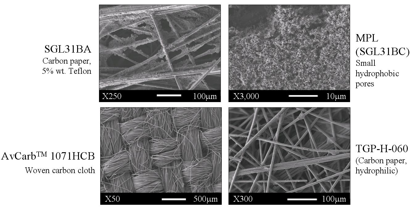 Special attention is devoted to the role of the microporous layer (MPL), due to its conflicting effects on water transport and cell durability. For improved water management, GDLs often have a dual-layer structure; with an MPL, highly hydrophobic coating with fine pore structure, deposited on a carbon fiber substrate (such as the one shown in Fig.1c). The MPL is less sensitive to flooding due to higher saturation pressure in the small hydrophobic pores. Our studies indicate that the GDL acts as a pressure valve for water condensed at the CL/GDL interface. The burst pressure of this ‘valve’ can be adjusted by tailoring the wetting properties of the GDL, and is increased five times when the MPL is present. Due to the high pressure barrier at the cathode CL/MPL interface, water is pushed across the membrane to the anode side. This effect was evidenced by optical imaging of liquid water accumulation in the anode channels. This is a unique study since the water distribution in the anode flow field was for the first time directly visualized.