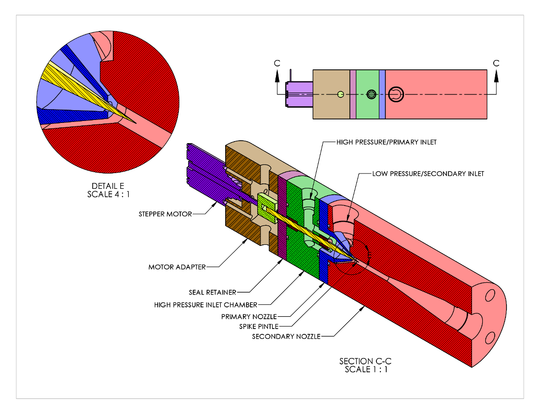 Because of hydrogen's low density, achieving the desired pressure increase of 4 psi across the stack requires that the flow from the primary nozzle be supersonic. To form a coherent jet when the primary nozzle orifice is occluded by the needle, the needle is made so that it extends through the primary nozzle and into the converging portion of the secondary nozzle. The flow then remains attached to the needle and accelerates, much as in an aerospike rocket motor, reaching up to Mach 2 in UD's ejector design. The needle also has the effect of occluding part of the secondary nozzle's throat when fully extended; since the greatest performance can be achieved by sizing the throat just slightly larger than what would be necessary to achieve sonic flow within, this effect improves the ejector's performance.