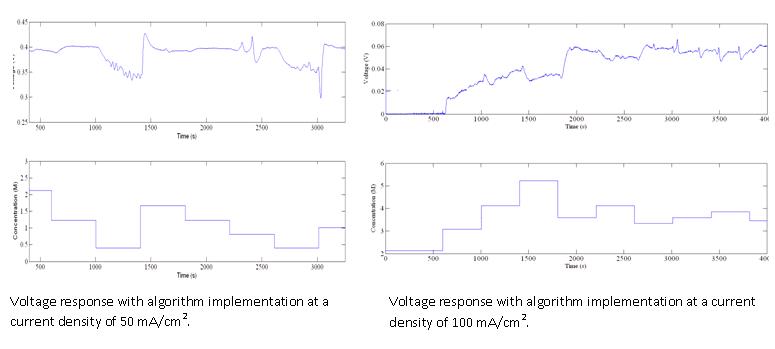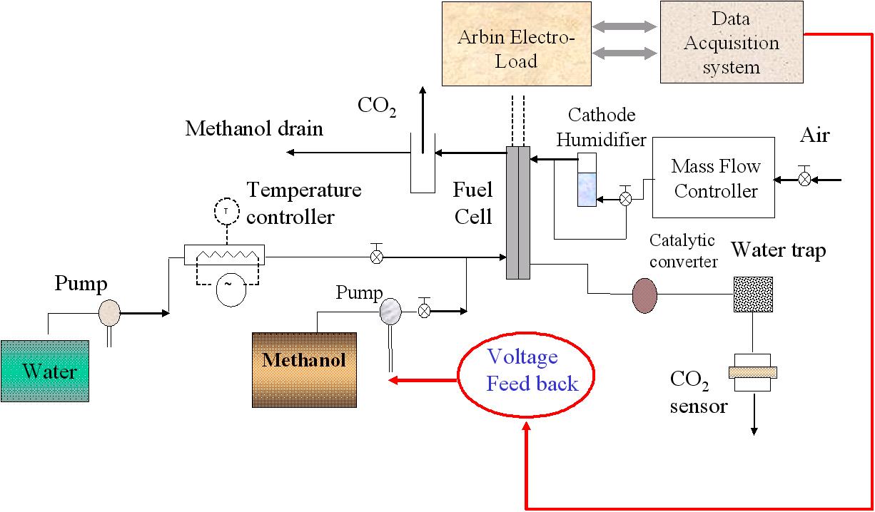 Regulating methanol feed concentration in direct methanol fuel cells (DMFCs) is important for improving electrical performance and fuel utilization. Low methanol concentration reduces the reaction rate at the anode due to Nernstian effects resulting in a lower operating voltage. However, simply increasing the methanol concentration does not always lead to improved performance due to increased methanol crossover from the anode to the cathode resulting in mixed-potential losses and the associated fuel loss. Hence, there exists an optimal intermediate value of methanol concentration for each current density that will yield the highest electrical performance (V). In this paper, we describe the development of an in situ methodology which uses the measured cell voltage as the feedback to regulate the methanol feed concentration for maximum power density. This methodology is demonstrated at the current densities of 50, 100, and 250 mA cm-2and the results for optimal concentration are presented. Fuel loss as a function of methanol concentration is evaluated by oxidizing the crossover methanol at the cathode exhaust and measuring the CO2 mass flux.