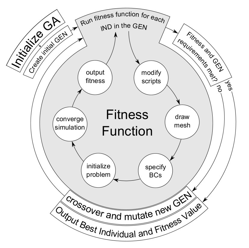 A genetic algorithm is a practical and effective way to search a relatively large search space for an optimum solution. This project uses the Genetic Algorithm (GA) Toolbox available as a MatLab© add-on module to control the optimization process. The module is a population and mutation based optimization process that is capable of looking for a maximum fitness value. For this research, an optimum solution will be a maximum current density at a given operating current density. A script has been written that calls the GA, which returns an initial set of individuals. Each individual is a set of numbers that describe a unique channel width, height, length, rib width, and GDL thickness. The script then calls GAMBIT© to create the model and mesh for an individual, sends the mesh to FLUENT© to run the fuel cell simulation, and receives an output of current density of the cell. A unique simulation is completed for each of the individuals, and the first set of individuals is known as the first generation. The first generation contains a set of randomly created fuel cells and their respective fitness values. The parameters of individuals that perform well are crossed to try to create better-performing individuals. The new set of individuals is called the first generation and each individual is evaluated for a new fitness value. This process is repeated until the population cannot create better performing individuals.