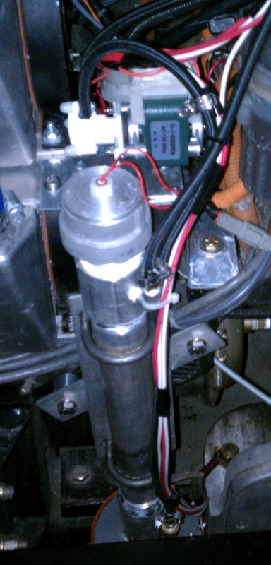 Even with the stack kept above freezing, damage could still occur if the fuel cell system is started up with some parts of the cooling system below freezing: sub-freezing coolant, circulating through the stack before it begins to produce heat, could freeze it from within. The higher-powered freeze protection system is designed to combat this by keeping the entire fuel cell coolant loop above freezing, except for the radiator. Since it demands more power than available from the 12 volt system, it runs on 120VAC line power, and operates only when the bus is plugged in for charging. It uses an immersion heater and pump to heat and circulate the coolant. It is controlled by two coolant temperature switches, one located on the roof of the bus, and the second located just before the coolant inlet to the heater. When the bus is subjected to cold temperatures, the coolant on the roof is the first to drop below the temperature setpoint, tripping the switch there and turning on the heating system. Heated coolant begins to circulate, moving up to the roof, while cold coolant returns to the heater, so that the second temperature switch is turned on, keeping the heater on until warm coolant has circulated around the entire loop.