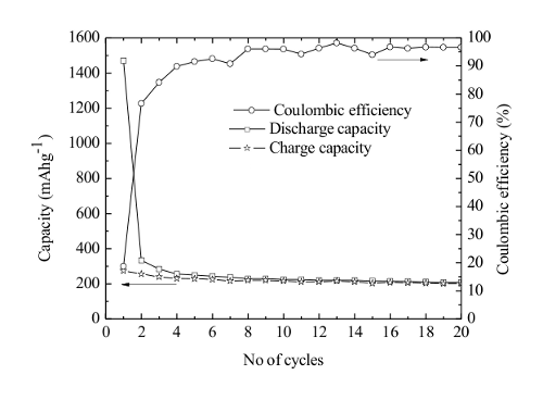 Polythiocyanogen, (SCN)x, is a promising lithium-ion battery electrode material due to its high theoretical capacity (462 mAh g-1), safe operation, inexpensive raw materials, and a simple and less energy-intensive manufacturing process. Polythiocyanogen was prepared from the solution of trithiocyanate (SCN)3- in methylene dichloride (MDC) by electrochemical oxidation of ammonium thiocyanate (NH4SCN) in a two-phase electrolysis medium of 1.0M NH4SCN in 0.50M H2SO4 + MDC. The (SCN)3- underwent autocatalytic polymerization to (SCN)x during MDC removal. Battery electrodes with (SCN)x as the active material were prepared, and tested in Swagelok cells using lithium foil as the counter electrode. The cells delivered capacities in the range of 200-275 mAh g-1 at the discharge-charge rate of 0.2C. The cells were tested up to 20 cycles and showed repeatable performance with a coulombic efficiency of 97% at the 20th cycle. These results indicate that (SCN)x is a promising lithium-ion battery electrode-material candidate for further studies.