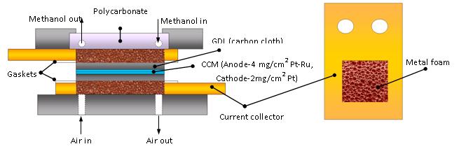 The feasibility of using metal foams as a GDL was also explored. It was found that metal foam performs better as a GDL compared to cloth and metal mesh. . It was found that the metal foams perform better as GDLs compared to cloth and metal mesh. Ni foam has good electrical conductivity compared to that of carbon cloth in which enhances performance. Although the mass transfer from the metal foam to the underlying gas diffusion layer (GDL) is diffusion-dominated, it is found that at a fixed methanol concentration, the limiting current density increases with increasing methanol flow rates. This unexpected result is attributed to the more efficient removal of product CO2 from the GDL. A methodology is developed to estimate the effective diffusion coefficient of methanol in the anode diffusion layer from limiting current density measurements, and to extract the fraction of GDL volume occupied by CO2.