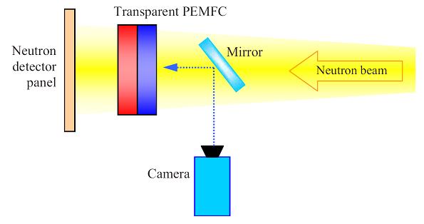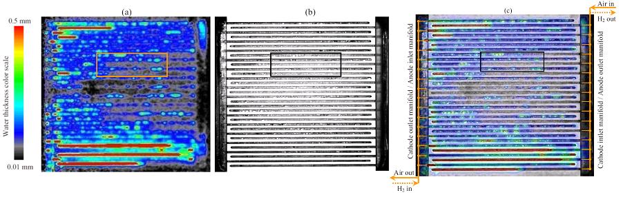 The concurrent images provide complementary data that allow one to separate the water distribution in the flow field from the remainder of the cell thickness, which has been a great challenge in water management studies. The combined technique therefore enables improved correlations between the water dynamics and cell performance. Further, higher spatial and temporal resolutions of the direct visualization enable improved interpretation of the smeared neutron signal in situations with highly dynamic water behavior. Optical images may also be used for in-situ calibration of the attenuation coefficient of water, which is necessary for accurate processing of neutron images. This novel experimental approach offers a potential to validate the neutron data, and to mitigate the error contributions associated with neutron imaging.